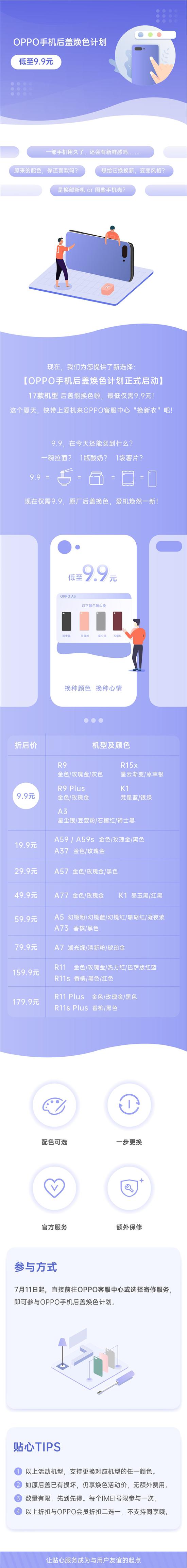 从7月11日起,用户可前往OPPO客服中心或选择寄修服务参与OPPO手机后盖焕色计划。