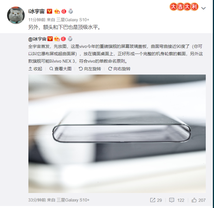 随后@i冰宇宙还补充道,vivo NEX 3在额头与下巴的表现都是顶尖的,说明其上下额头的宽度表现应该不错,黑边更小。
