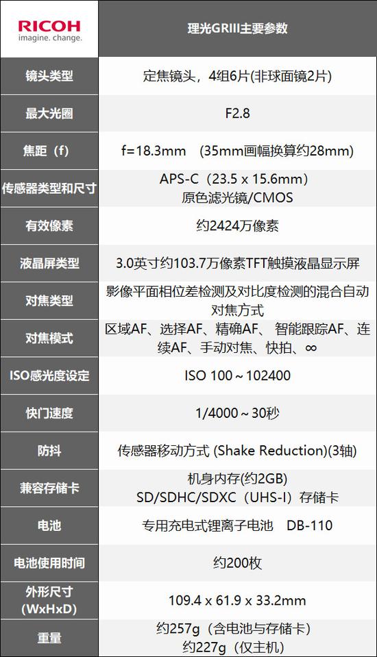 理光GRIII秉承GR系列一贯的设计理念,更加强化拍摄画质,对焦速度,便携性等相机本身的价值。与上一代GRII相比,更新了镜头、COMS、画像处理引擎等主要的元件,机身也更加小巧,可以说是一款焕然一新的产品。